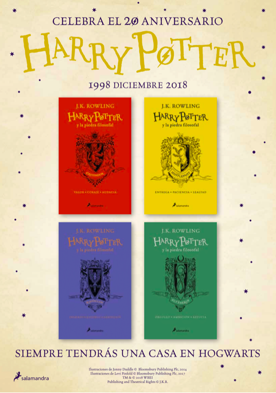 Para celebrar, Salamandra lanzará cuatro ediciones especiales de Harry Pottery la piedra filosofal. Cada una dedicada a una de las casas de Hogwarts: Gryffindor, Slytherin, Ravenclaw y Hufflepuff.